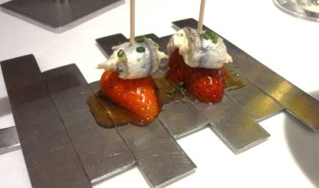 Başlangıç olarak kırmızı morina, çilekli hamsi, kadayıflı peynirli puding, tonikli chorizo alıyoruz. Oldukça yağlı chorizo tonikle mükemmel işlenmiş ve yukardan basılarak ezilmiş bir tonik kutusu üzerinde servis ediliyor. Yan yana hiç düşünülemeyecek hamsi ve çilek ise ilginç bir uyum içinde .