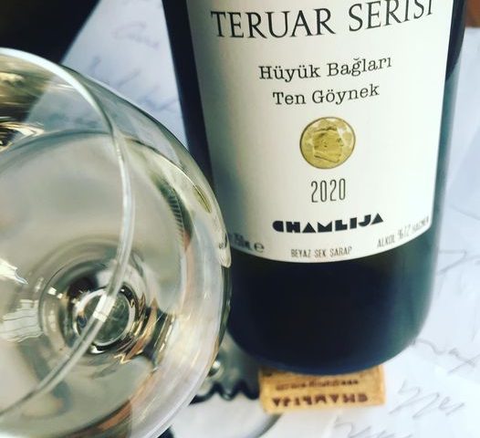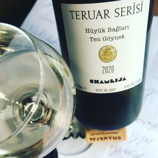 Chamlija Teruar Serisi Hüyük Bağları Ten Göynek 2020. Konya Beyşehir Gölü kıyısında bulunan 70 yaşını aşmış, Hüyük Bağlarından yetişen %100 Ten Göynek üzümü, düşük basınçta karbon buzu ile alınan şırası çelik tanklarda mayalanmış 3 ay meşe fıçılarda dinlendirildikten sonra kısıtlı filtrasyon yapılarak şişelenmiş. Alkol:%12.